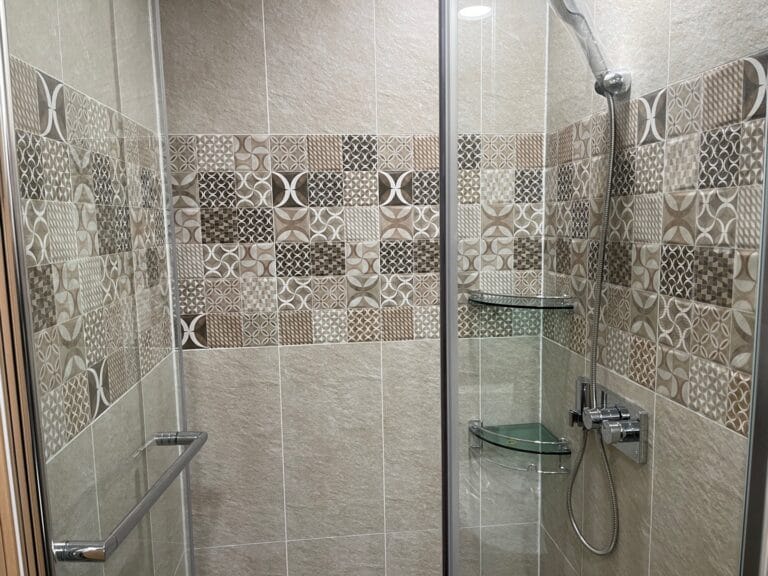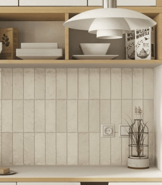포인트는 화이트 베이스에 약간의 베이지와 회색빛이 도는 수입타일이에요. 표면이 균일하지 않은 핸드메이드 제품이기 때문에 각도에 따라 빛이 반사되어 다채로운 느낌이 들어요.