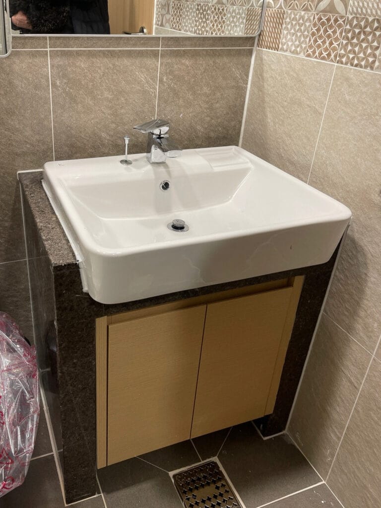신축인데도 불구하고 타일, 도기, 악세서리들이 다소 올드한 느낌이 드는 것 같아요. 수납장과 타일이 왠지 약간 우중충해? 보이기도 한 것 같고요. 하루 빨리 변화가 필요한 공간이었어요.