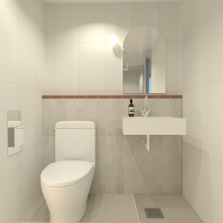 앨리스에게 보여드렸던 시안의 이미지와 정말 비슷하죠? 원래 계획에서는 포인트 타일을 하부에 하려고 했었는데, 타일이 빛에 아롱아롱한 느낌이 너무 예뻐서 위로 올리기로 했어요. 역시나 너무 좋은 선택이었던 것 같습니다. 깔끔하면서도 이국적인 느낌이 돋보이는 디자인으로 완성되었어요.