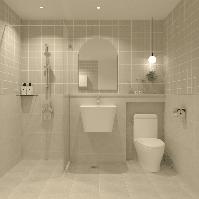 따뜻한 색감의 벽타일과 바닥타일에 편안한 느낌의 자체 제작 우드장을 매치했습니다. 고급 사우나에 들어가는 것 같은 편안한 분위기를 연출했어요. 우드와 베이지가 주는 온화함을 느껴보세요.