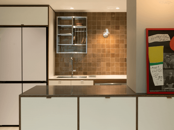 상부와 하부에 다른 타일을 조합해 평범하지 않으면서도 질리지 않는 클래식한 디자인을 연출했어요. 천장에서 내려오는 펜던트 조명이 분위기를 더욱 아늑하게 만들어줍니다.