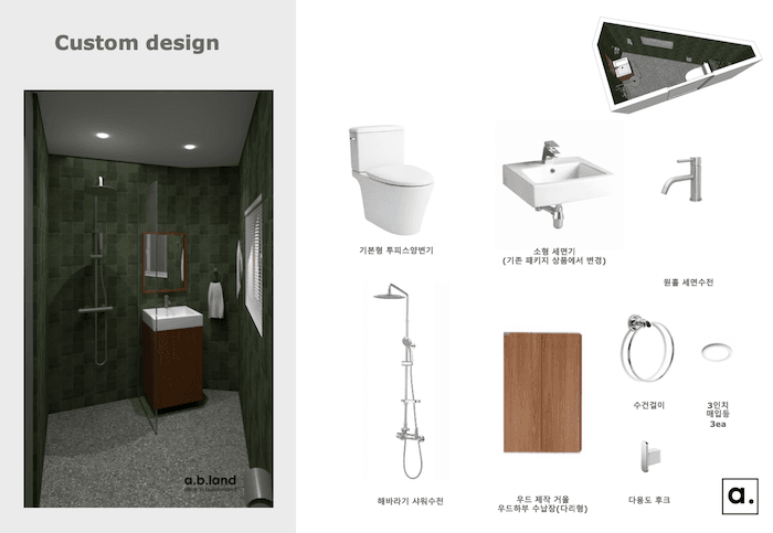 하지만 좁고 독특한 구조의 욕실이라고 예뻐질 수 없는건 아니에요, 에이비랜드의 디자이너와 전문 상담을 통해 앨리스의 욕실 구조에 맞는 1:1 맞춤 디자인이 들어갔습니다.
