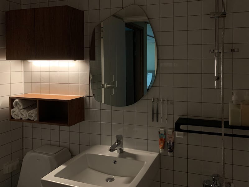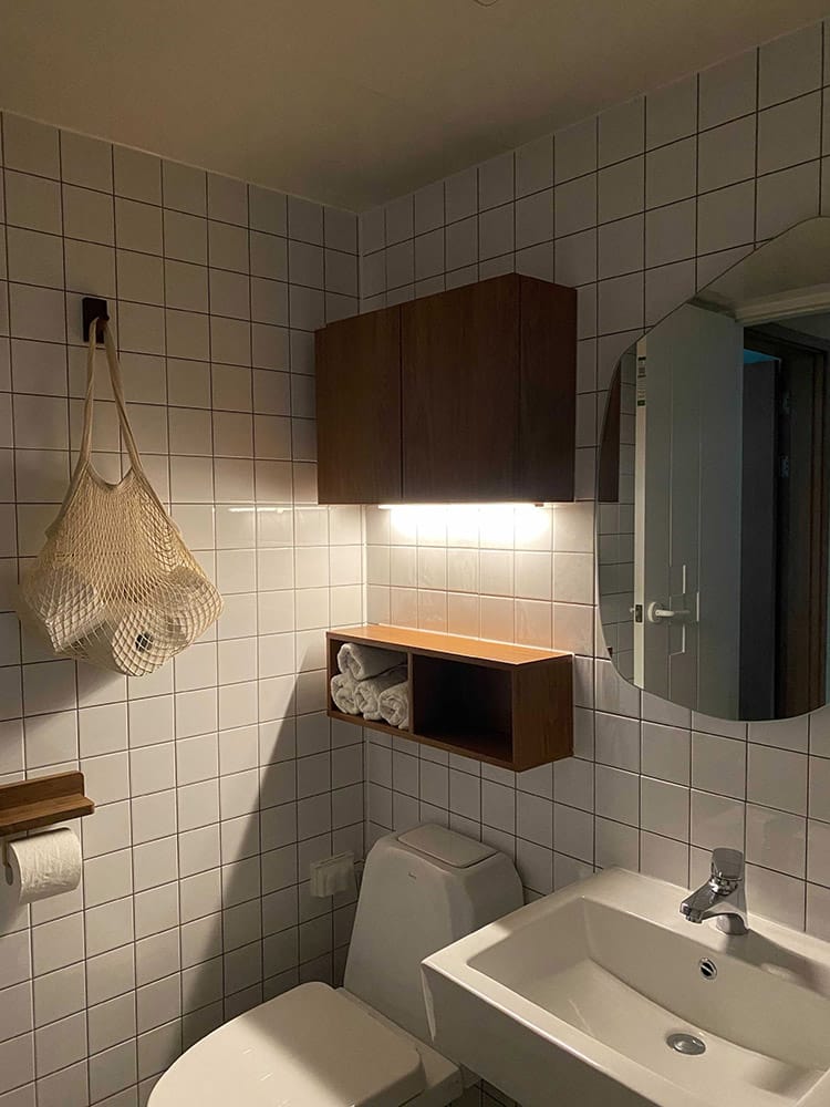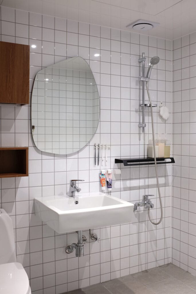 우드장과 화이트타일에 비정형의 망고 거울까지 더해지니 화이트 우드 인테리어만의 아기자기한 느낌이 더욱 돋보였어요.